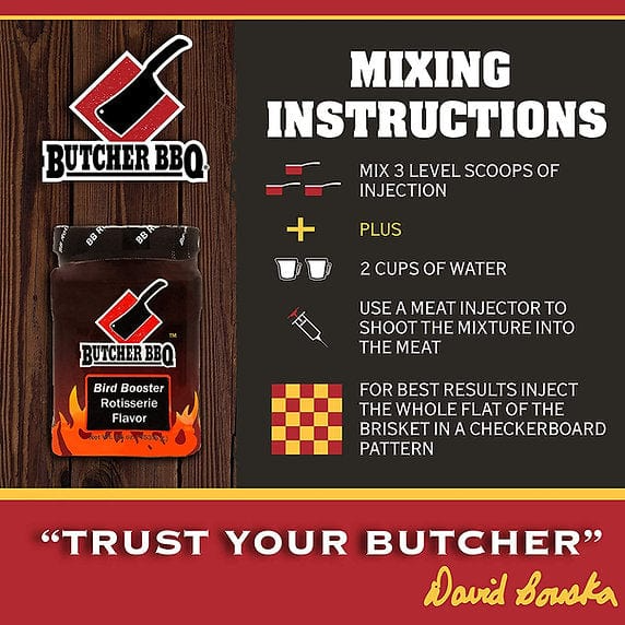 Butcher BBQ Bird Booster Honey Flavor Bird Booster Injection / marinade is your answer to How long do I inject chicken before cooking along with What's the best recipe? With our product you never have to worry about a messy brine again. Cooking for competition or home our easy to mix product works for smoking chicken or turkeys. Even a grilled chicken breast recipe is easy.