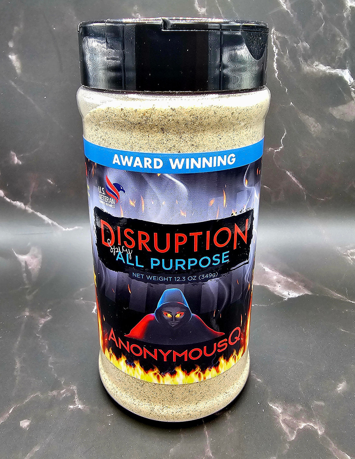 Savory, Garlicky, Oniony with a bit of heat! AnonymousQ Disruption "Spicy" AP Rub is a perfect balance of herbs, spices, umami flavors and sugar with a bit of back end heat. The mix of ingredients truly brings out all of the flavor in pork, beef, chicken, fish, and all of your veggies. Use as a base layer to any protein.