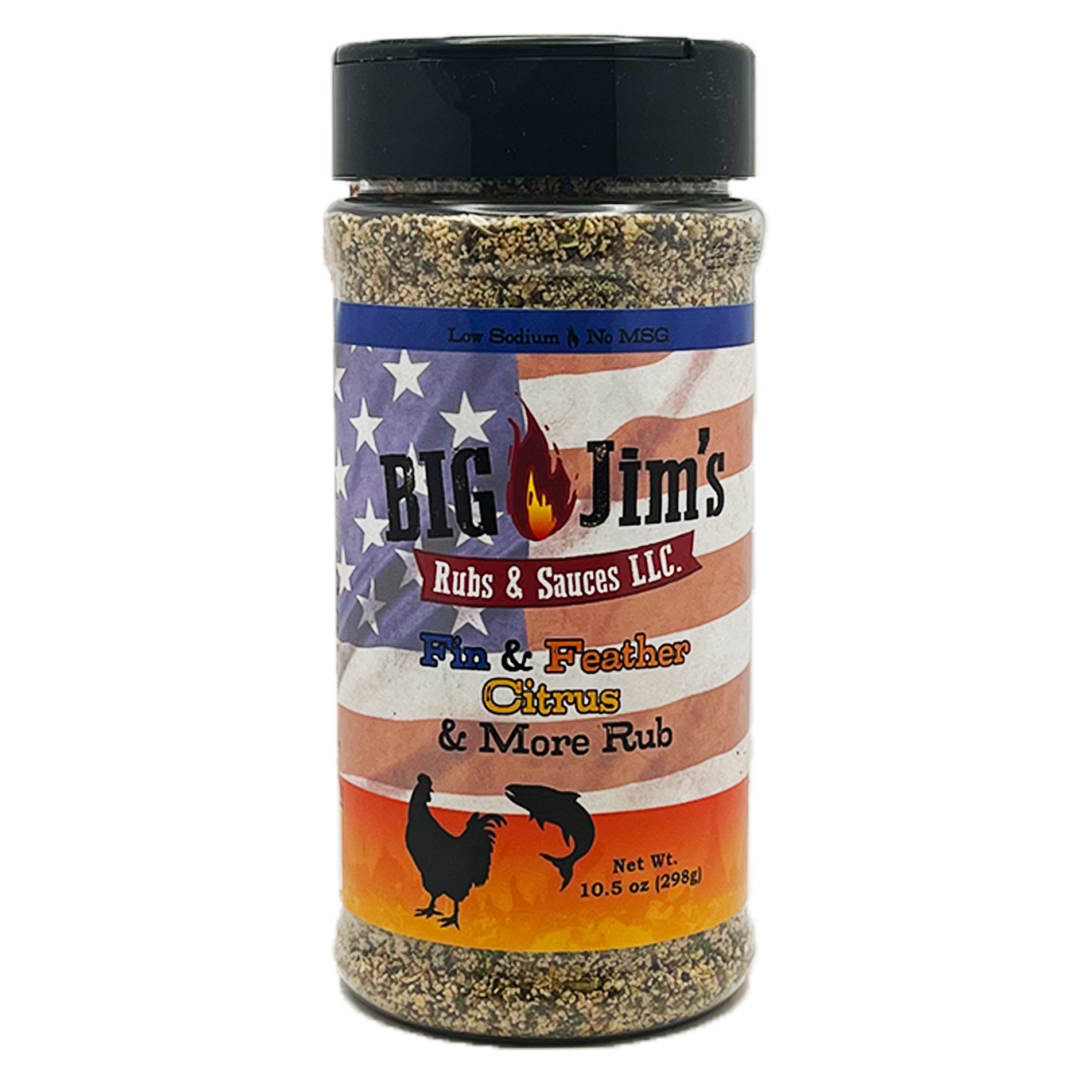 Big Jim’s Fin & Feather Citrus and More Rub will take your fish and chicken to the next level. Use it one time and your taste buds will be screaming for more. Fin & Feather Citrus and More rub will take your pork flavors off the charts. Try mixing some in your favorite sauce to give your ribs a ultimate glaze. Use your imagination to impress your family and friends as a secret ingredient of flavor.
