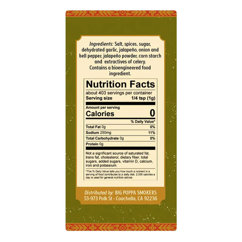 - Ingredients: Salt, spices, sugar, dehydrated garlic, jalapeño, onion and bell pepper, jalapeño powder, corn starch and extractives of celery.