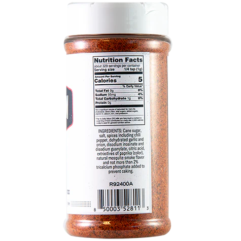 - INGREDIENTS: Cane sugar, salt, spices including chili pepper, dehydrated garlic and onion, disodium inosinate and disodium guanylate, citric acid extractive of paprika (color); natural mesquite smoke flavor and not more than 2% tricalcium phosphate added to prevent caking.