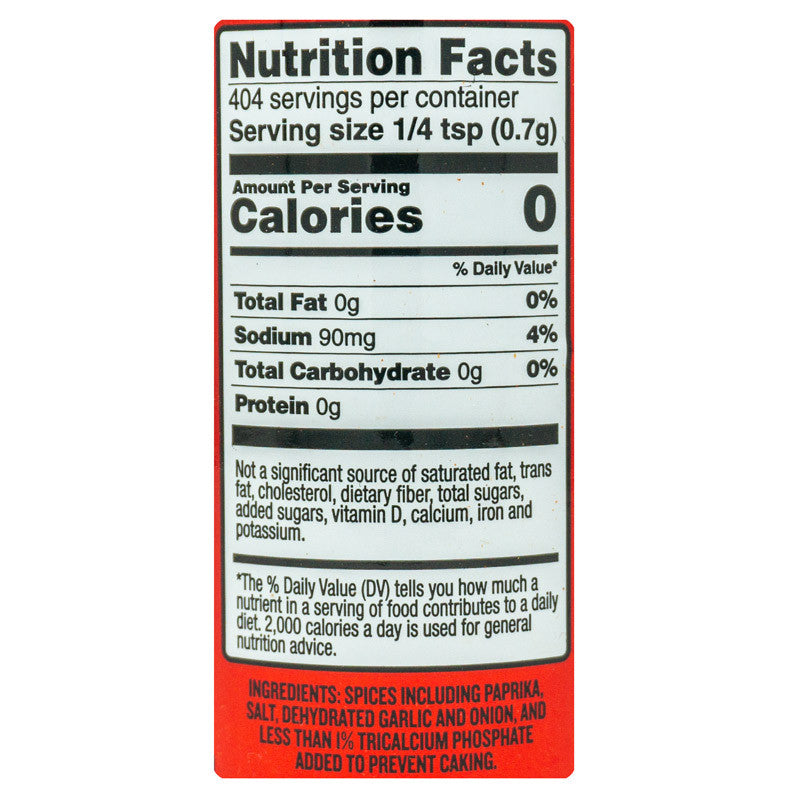 - INGREDIENTS: SPICES INCLUDING PAPRIKA, SALT, DEHYDRATED GARLIC AND ONION; AND LESS THAN 1% TRICALCIUM PHOSPHATE ADDED TO PREVENT CAKING.