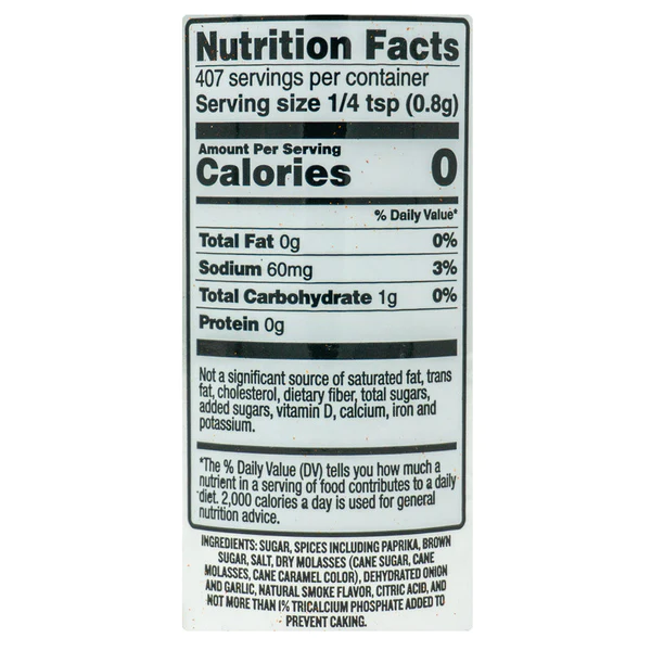 - Ingredients: Sugar, spices including paprika, brown sugar, salt, dry molasses (cane sugar, cane molasses, cane caramel color), dehydrated onion and garlic, natural smoke flavor, citric acid, and not more than 1% tricalcium phosphate added to prevent caking.