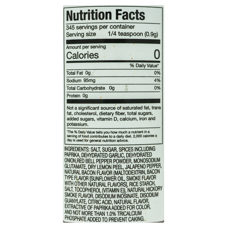 - INGREDIENTS: SALT, SUGAR, SPICES INCLUDING PAPRIKA, DEHYDRATED GARLIC, DEHYDRATED ONION, RED BELL PEPPER POWDER, MONOSODIUM GLUTAMATE, DRY LEMON PEEL, JALAPENO PEPPER, NATURAL BACON FLAVOR (MALTODEXTRIN, BACON TYPE FLAVOR SUNFLOWER OIL SMOKE FLAVOR WITH OTHER NATURAL FLAVORS, RICE STARCH, SALT, TOCOPHEROL VITAMIN E), NATURAL HICKORY SMOKE FLAVOR, DISODIUM INOSINATE, DISODIUM GUANYLATE, CITRIC ACID, NATURAL FLAVOR. EXTRACTIVE OF PAPRIKA ADDED FOR COLOR, AND NOT MORE THAN 1.0% TRICALCIUM PHOSPHATE ADDED TO PREVENT CAKING.