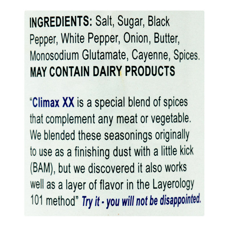Climax XX BAM is a perfect blend of herbs and spices with a little kick at the end! It appears to be spicy out of the bottle, but don’t let that fool you. Climax XX uses jalapeno powder which when heated mellows out to produce just a kick at the end. This special blend of spices was originally created as a finishing dust, used to sprinkle on SCA Steaks after they have been cooked just before turn in. This also works well as a layer of flavor in the "Layerology 101 method.” If you are looking to add a little something extra to your steaks, burgers, ribs and vegetables, you will not be disappointed. This product is an exciting new flavor added to the already impressive the Hotty Totty BBQ Crew and Arkassissippi family!