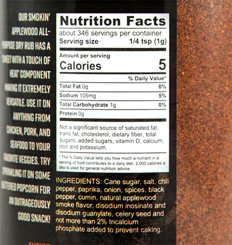 - INGREDIENTS: Cane sugar, salt, chill pepper, paprika, onion, spices, black pepper, cumin, natural Applewood smoke flavor, disodium inosinate and disodium guanylate, celery seed and not more than 2% tricalcium phosphate added to prevent caking.