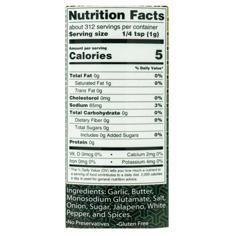 - INGREDIENTS: Garlic, Butter, Monosodium Glutamate, Salt, Onion, Sugar, Jalapeno, White Pepper, and Spices.
