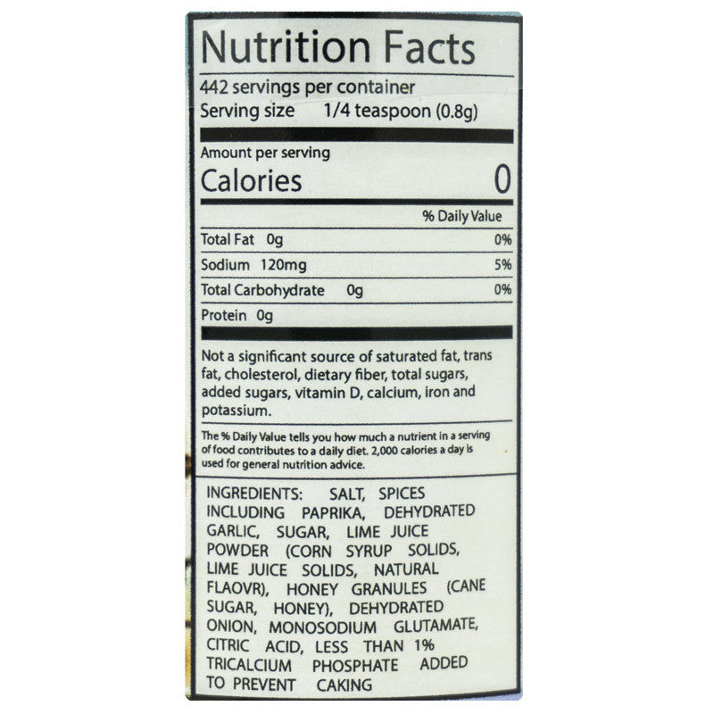 - INGREDIENTS: SALT, PAPRIKA, DEHYDRATED GARLIC, SUGAR, LIME JUICE POWDER (CORN SYRUP SOLIDS, LIME JUICE SOLIDS, NATURAL FLAVOR), HONEY GRANULES (CANE SUGAR, HONEY), DEHYDRATED ONION, MONOSODIUM GLUTAMATE, CITRIC ACID, LESS THAN 1% TRICALCIUM PHOSPHATE ADDED TO PREVENT CAKING