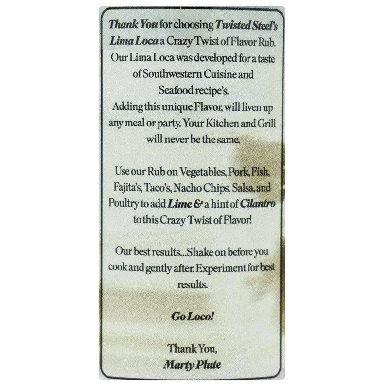 Twisted Steel's Lima Loca is a crazy twist of flavor rub. Lima Loca was developed for taste of southwestern cuisine and seafood recipes. Adding this unique flavor will liven up any meal or party. Your kitchen and grill will never be the same. Use this rub on vegetables, pork, fish, fajitas, tacos, nacho chips, salsa and poultry to add LIME & a hint of CILANTRO to this crazy twist of flavor! For best results, shake on before you cook and gently after. Experiment for the best results. GO LOCO!!