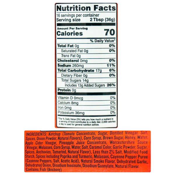 - Ingredients: Ketchup (Tomato Concentrate, Sugar, Distilled Vinegar, Salt, Spices, Onion Powder, Natural Flavors), Corn Syrup, Brown Sugar, Honey, Water, Apple Cider Vinegar, Pineapple Juice Concentrate, Worcestershire Sauce (Vinegar, Molasses, Corn Syrup, Water, Salt, Caramel Color, Garlic Powder, Sugar, Spices, Anchovies, Tamarind, Natural Flavor), Less than 2% Salt, Modified Food Starch, Spices including Paprika and Turmeric, Molasses, Cayenne Pepper Puree (Cayenne Peppers, Salt, Acetic Acid), Natural Smoke Flavor, Dehydrated Garlic, Dehydrated Onion, Disodium Inosinate, Disodium Guanylate, Natural Flavor.