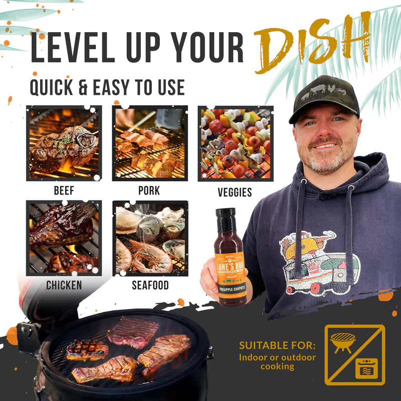Introducing Lane's BBQ Pineapple Chipotle Sauce, the perfect combination of sweet and smoky flavors to elevate your BBQ dishes to a tropical level. This sauce is expertly crafted with premium quality ingredients like pineapple, chipotle pepper powder, and brown sugar, creating a delicious blend of flavors that will tantalize your taste buds. The sweetness from the pineapple is perfectly balanced with the smoky and spicy notes from the chipotle peppers, delivering a unique and complex flavor that is sure to impress. Whether you're grilling, smoking, or roasting, this versatile sauce is perfect for adding a delicious layer of flavor to your meats and vegetables. With Lane's BBQ Pineapple Chipotle Sauce, you'll add a tropical twist to your dishes, making every meal a delicious and unforgettable experience.