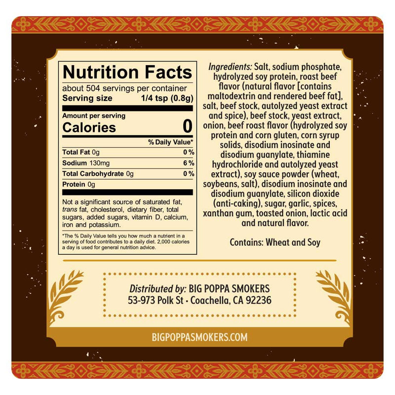- Ingredients: Salt, sodium phosphate, hydrolyzed soy protein, roast beef flavor (natural flavor [contains maltodextrin and rendered beef fat], salt. beef stock, autolyzed yeast extract, onion and garlic powder, beef roast flavor (hydrolyzed soy protein and corn gluten, corn syrup solids, disodium inosinate, and disodium guanylate, thiamine hydrochloride, and autolyzed yeast extract), soy sauce powder (wheat, soybeans, salt), disodium inosinate, and disodium guanylate, silicon dioxide (anti-caking), sugar spices, xanthan gum, and lactic acid and natural flavor