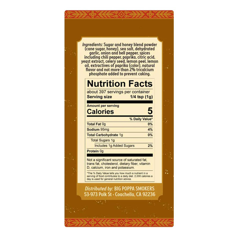 - Ingredients: Evaporated cane juice, sea salt, granulated honey (refinery syrup, honey), dehydrated garlic, onion, bell peppers, paprika, yeas extract, celery, natural flavors, extractives of paprika (color).