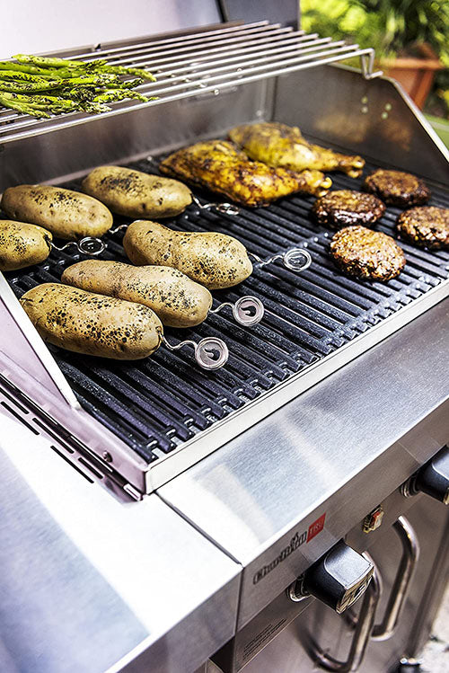 These stainless steel Potato screws deliver a new turn on an old Trick for even heating. Perfectly cook potatoes on your grill with stainless steel Potato screws that promote quick & even heating. The corkscrew design allows for safer, more secure loading than standard Potato nails. With a convenient storage case that holds up to six Potato screws, grill potatoes with ease with stainless steel Potato screws from Char-Broil.