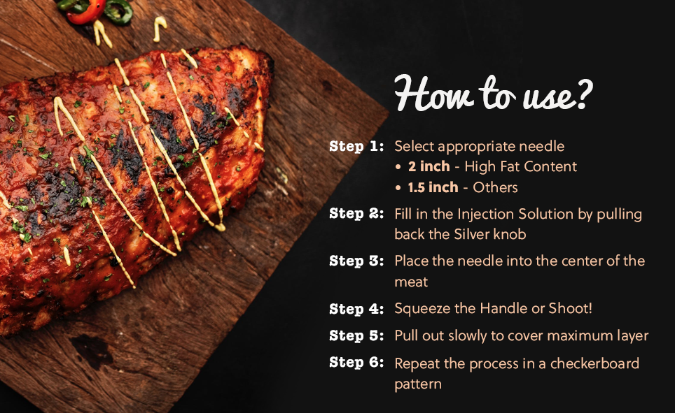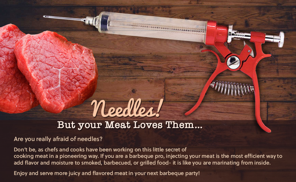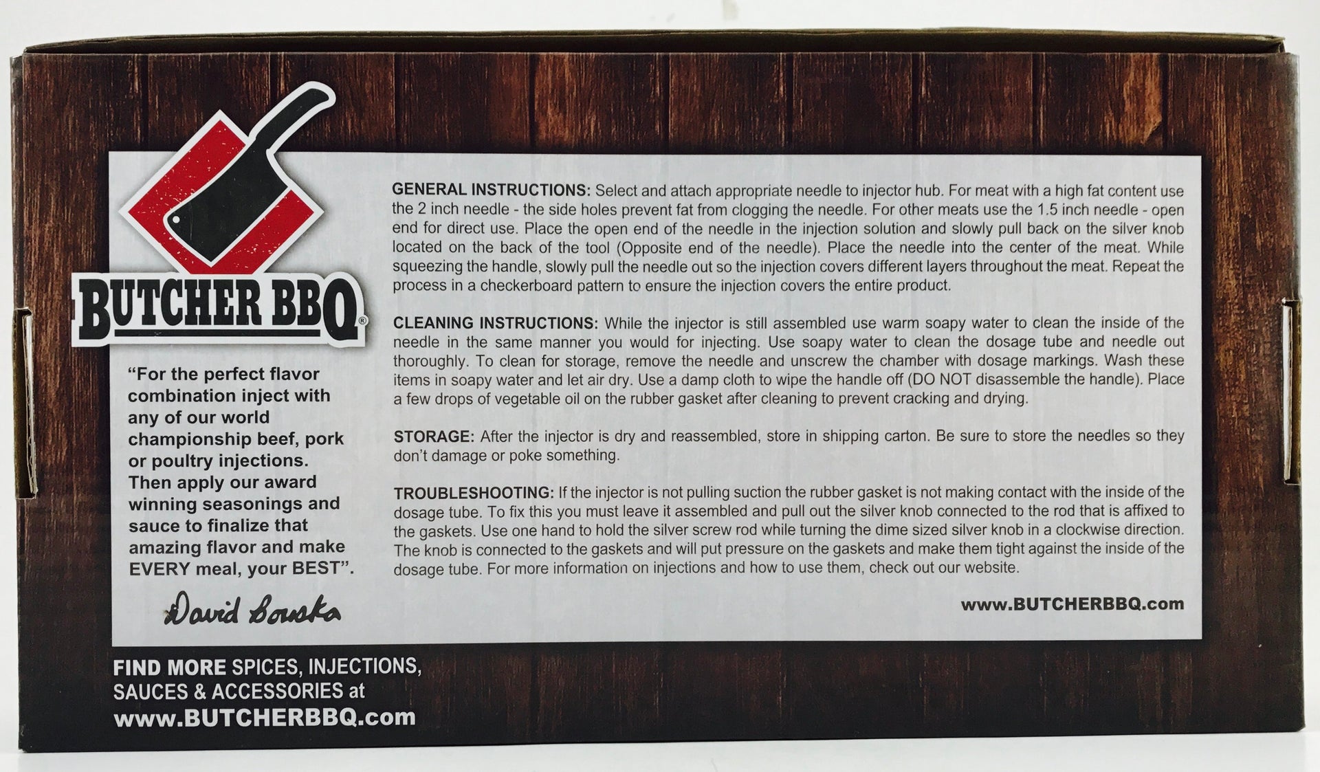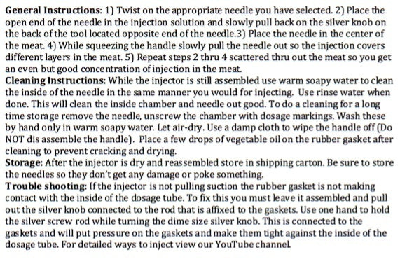 Our pistol grip injector is the best food injector you can buy. It's made with a high quality metal handle and 50cc pistol grip syringe. Easy to use and clean. Comes with replacement gasket, a cleaning brush, and 2 different needles for different meats. Don't be fooled with injectors made of plastic handles. With proper care this injector will last years.