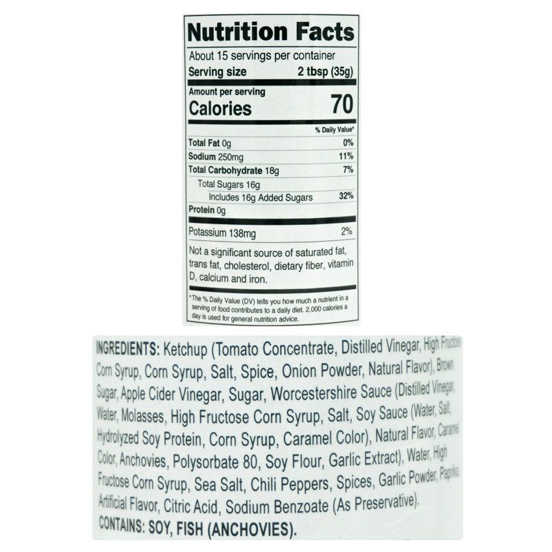 - INGREDIENTS: Ketchup (Tomato Concentrate, Distilled Vinegar, High Fructose Corn Syrup, Corn Syrup, Salt, Spice, Onion Powder, Natural Flavor, Brown Sugar, Apple Cider Vinegar, Sugar, Worcestershire Sauce (Distilled Vinegar, Water, Molasses, High Fructose Corn Syrup, Salt, Soy Sauce (Water, Salt, Hydrolyzed Soy Protein, Corn Syrup, Caramel Color), Natural Flavor, Caramel Color, Anchovies, Polysorbate 80, Soy Flour, Garlic Extract), Water, High Fructose Corn Syrup, Sea Salt, Chili Peppers, Spices, Garlic Powder Paprika, Artificial Flavor, Citric Acid, Sodium Benzoate (As Preservative)