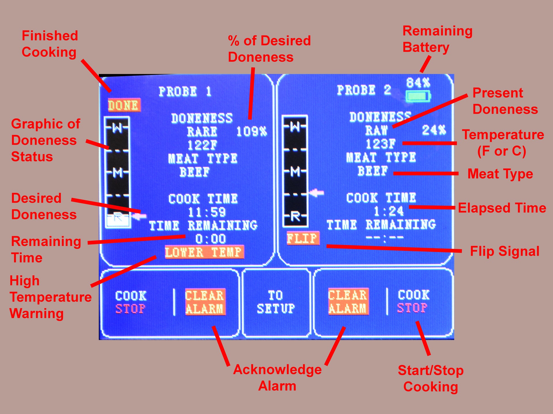 - Select the meat type and select from 15 desired doneness levels, rather than a preset temperature that is assuming the meat will be done when the temperature is reached
