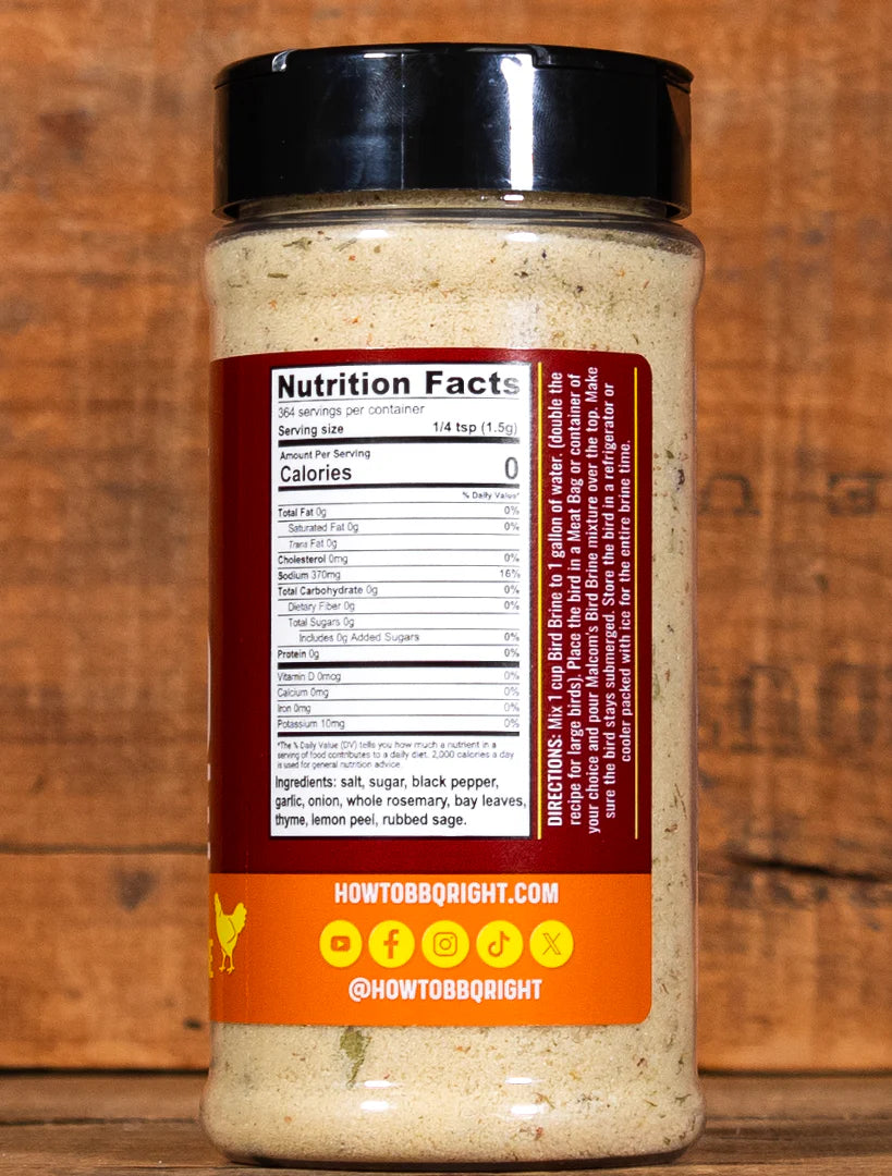 Mix 1 cup Bird Brine to 1 gallon of water. (Double the recipe for large birds). Place the bird (turkey, chicken, goose, duck, etc...) in a Meat Bag or container of your choice and pour Malcom's Bird Brine mixture over the top. Make sure the bird stays submerged - weigh down with a plate if necessary. Store the bird in a refrigerator or cooler packed with ice for the entire brine time.