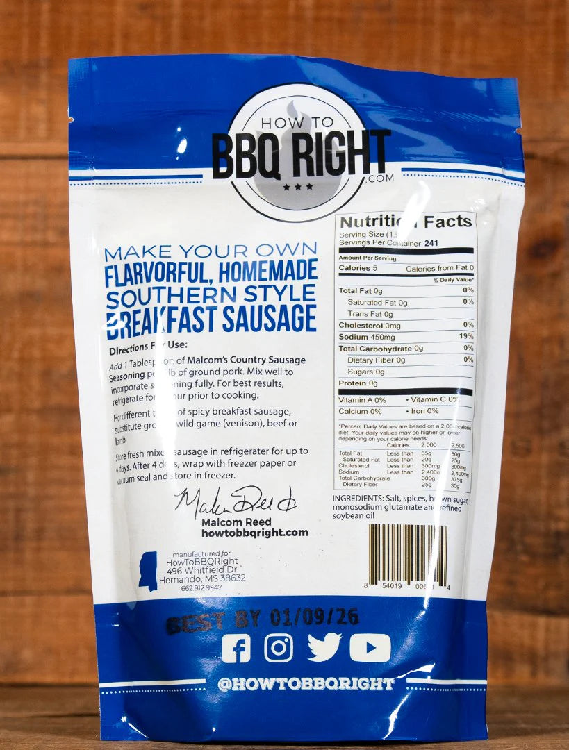 Directions for use: Add 1 Tablespoon of Malcom's Country Sausage Seasoning per 1lb ground pork. Mix well to incorporate seasons fully. For best results, refrigerate for 1 hour prior to cooking.