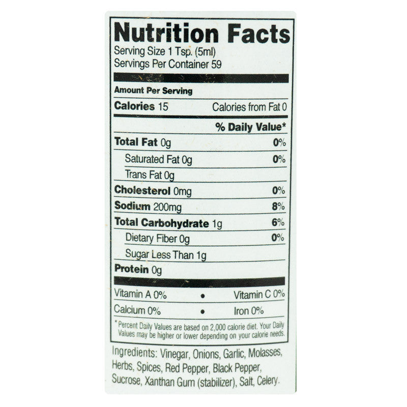 - Ingredients: Vinegar, Onions, Garlic, Molasses, Herbs, Spices, Red Pepper, Black Pepper, Sucrose, Xanthan Gum (stabilizer), Salt, Celery.