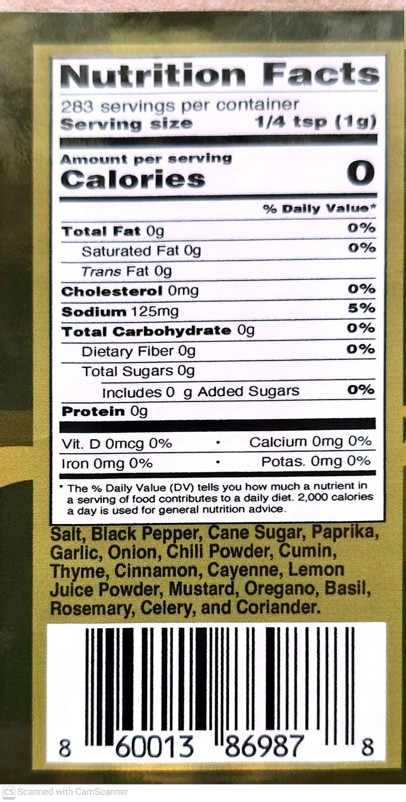 - Ingredients: Salt, black pepper, cane sugar, paprika, garlic, onion, chili powder, cumin, thyme, cinnamon, cayenne, lemon juice powder, mustard, oregano, basil, Rosemary, celery, and coriander.