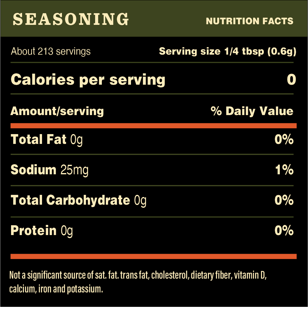 - Ingredients: Spices (including mustard and celery seed), paprika (color), dried garlic, monosodium glutamate, salt, calcium stearate (anti-caking agent)