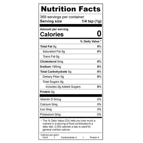 - Ingredients: Sea salt, garlic, black pepper, turbinado sugar, onion, sugar, lemon juice powder, lemon oil and spices.